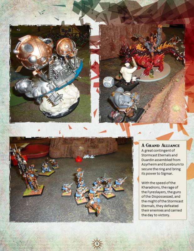 I like to make campaign books, so here are the pages I made for our Coalescence event (the first spread and last spread include the official intro and outro fluff). Basically, we had 4 Order armies (Kharadrons, Fyreslayers, Stormcasts, and a Stormcasts & Dwarf alliance), 2 Destruction (Ogors and Bonesplitterz), 1 Flesh-Eater Courts, and 1 Bloodbound. The Kharadrons were the only army to win in Round 1. After that, Order cleaned up pretty well. One funny thing we ended up doing was we avoided having two Underdog Grand Alliances by combining Flesh-Eaters and Bloodbound into Grand Alliance Cannibals; they didn’t get far though. All of the pictures used on these pages are from the event.