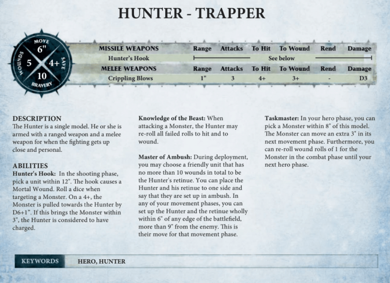 The hunters can use one of two different warscrolls which represents the Trapper, a model armed with a Hunter’s Hook and has a special ability to set an ambush, or the Tamer, a wizard which employs a bit more charm with monsters on the tabletop.