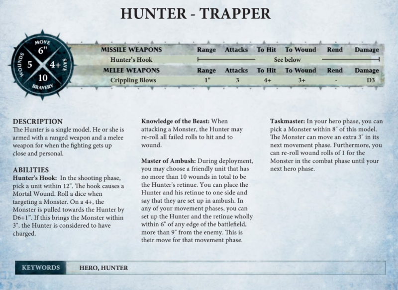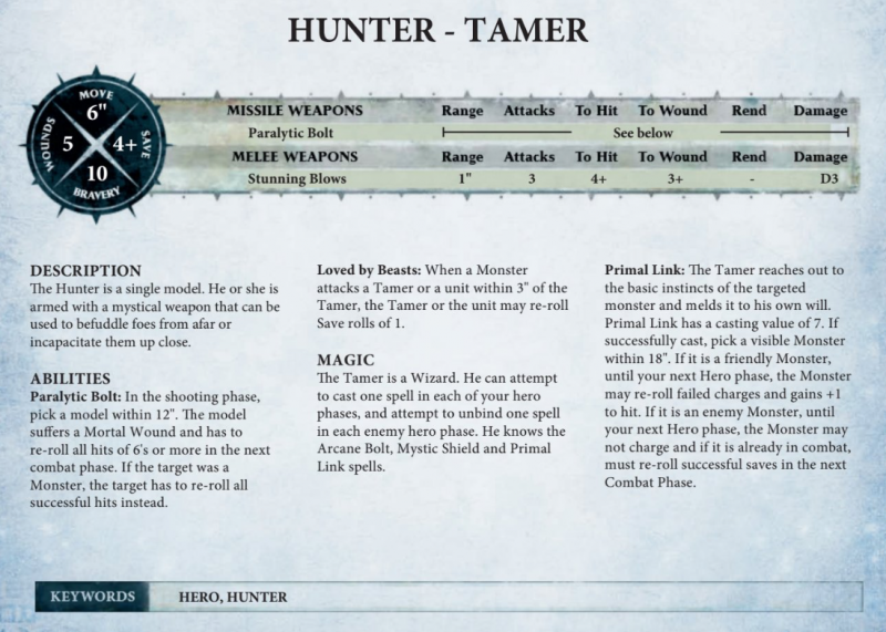 The hunters can use one of two different warscrolls which represents the Trapper, a model armed with a Hunter’s Hook and has a special ability to set an ambush, or the Tamer, a wizard which employs a bit more charm with monsters on the tabletop.