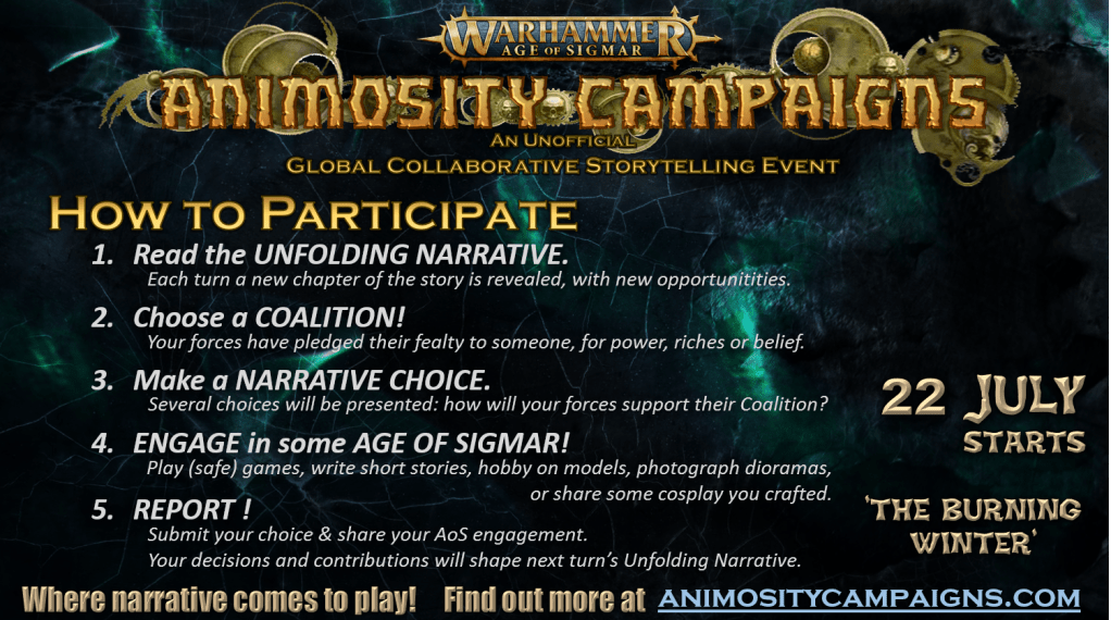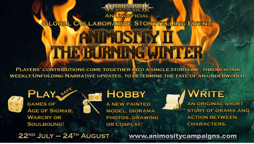 This year, players will be able to participate in Animosity II: The Burning Winter through whatever way they enjoy their hobby the most: single-player (or safe) games of Age of Sigmar and Warcry, Soulbound roleplay sessions, painted and/or converted models, action shot photography of a battle set-up, short stories, drawn artwork and even cosplay!