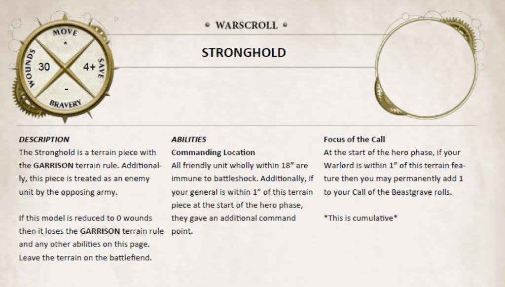 Q: One big feature of the battle is that each team will have a Stronghold, made up of several pieces of terrain clumped together, garrisonable and with its own warscroll. Tell us more about it.