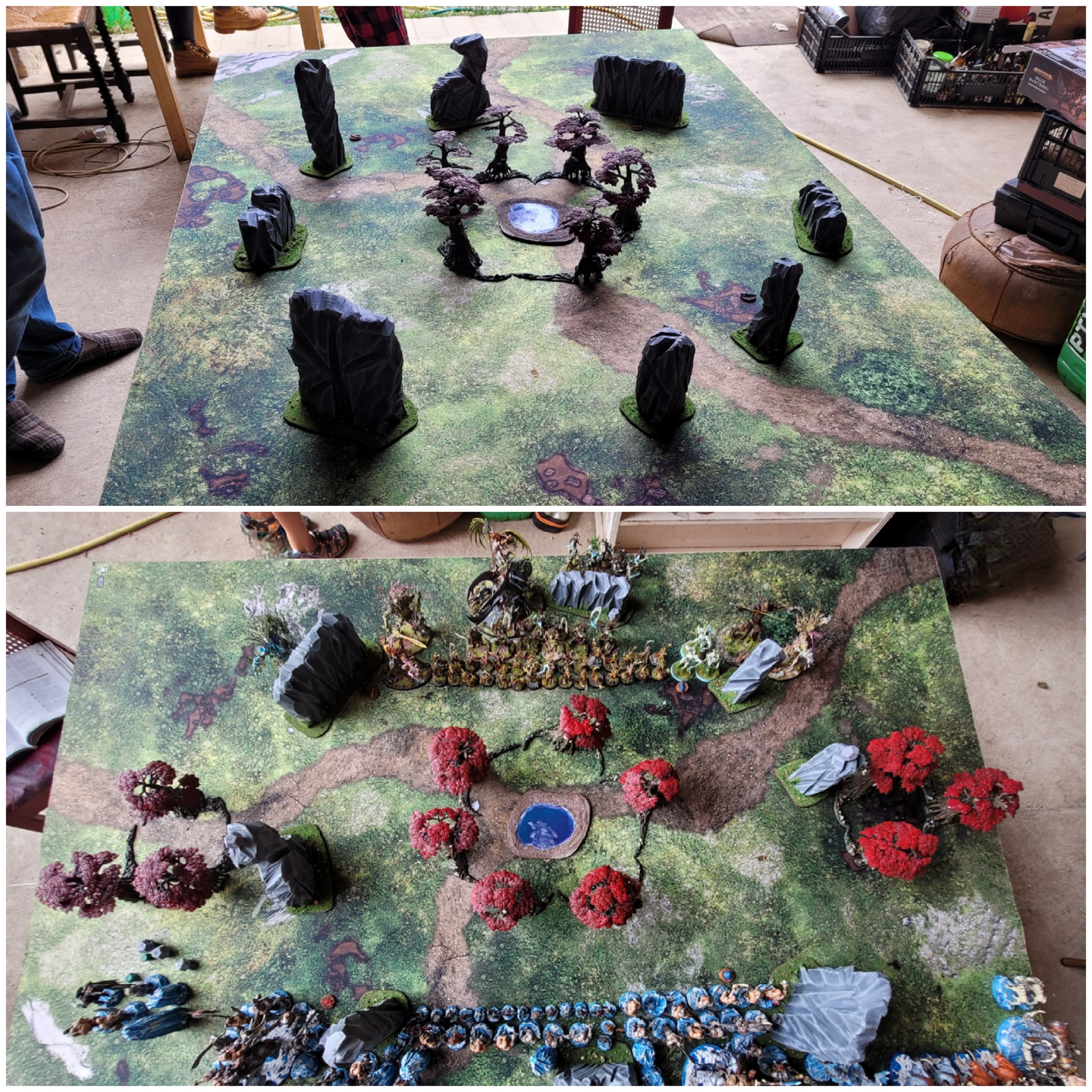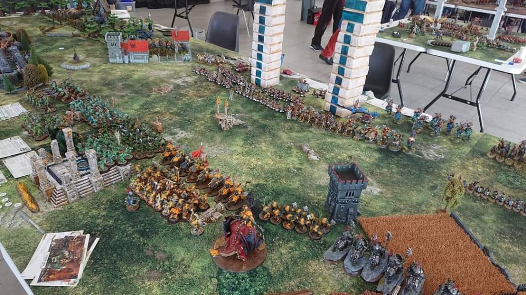 Players start in 1vs1 games at 3000pts on a 44×60” table, until the end of round 2 like a normal game. At the beginning of round 3, we open the borders to adjacent tables: phases are now coordinated (initiative roll etc.), from round-to-round, the players can shoot across, moving from table to table on their respective kingdoms, etc.