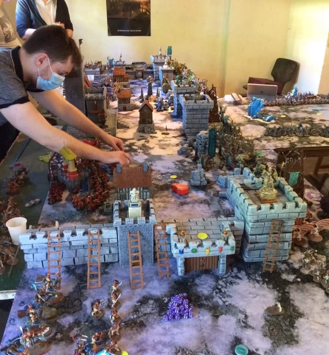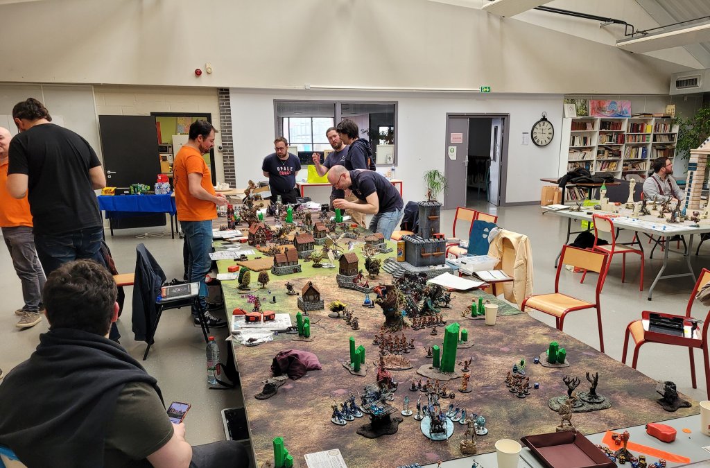 Les Batailles Fantastiques is a community of storytelling Warhammer gamers, who organize regular events that bring together players for giant megabattles. The NEOs (Narrative Event Organizers) act as Game Masters and allow for coordinated player efforts across tables, full of special rules and affecting enemies from all across the hall.