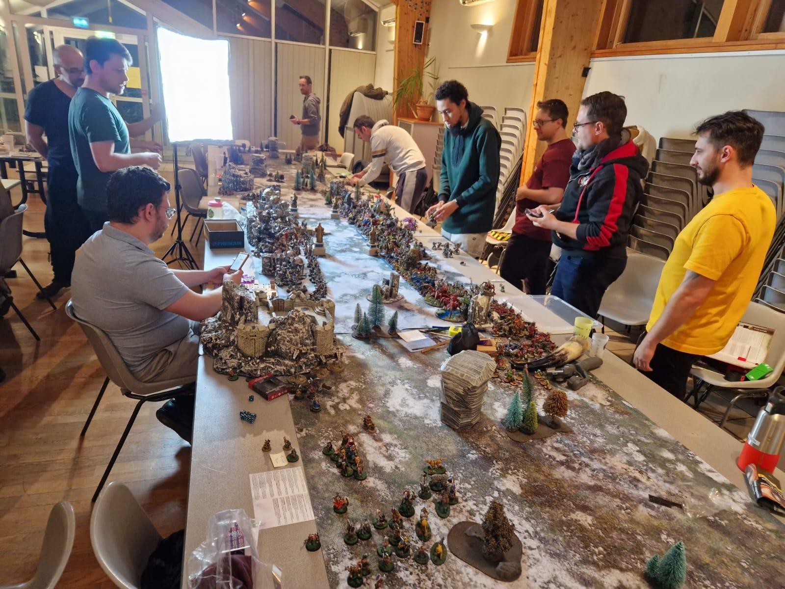 Depending on the arrival time of every player, several pick-up games at 1500pts (leveled and drawn from the main list) are played to get acquainted and get back into it and allow less experienced players to learn tips and experience against a more seasoned benevolent player. Like a warm-up.