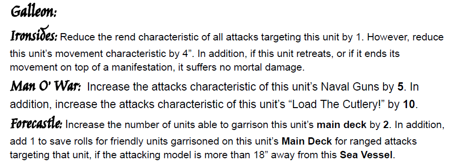 We have 2 sizes of Sea Vessels: Galleons and Frigates. Galleons, being much larger, have upgrades that are focused on either increasing their potential damage output, or their resistance to damage, as vessels built to withstand the most brutal of combat on the high seas. Frigates, being a bit smaller and having less health, find their usefulness comes from their increased speed, and the upgrades available to Frigates either increase their speed, or improve their utility in other ways. One of our event staff, Keith Udy, did have the crazy idea of borrowing the “Rampaging Destruction” ability from Kragnos’ Warscroll, and modifying it to become the “Hel’s Head Explosive Battering Ram” upgrade, with the potential of doing a high amount of damage to enemy Sea Vessels once per game. And so that was a mechanic we felt had to be included! Depending on list composition, army lore, etc. some players may feel more fitted using a Frigate, and others a Galleon. And so when players are teamed up for their 2v2 naval battle, they will get to work together to choose the ships and upgrades that feel right to them.