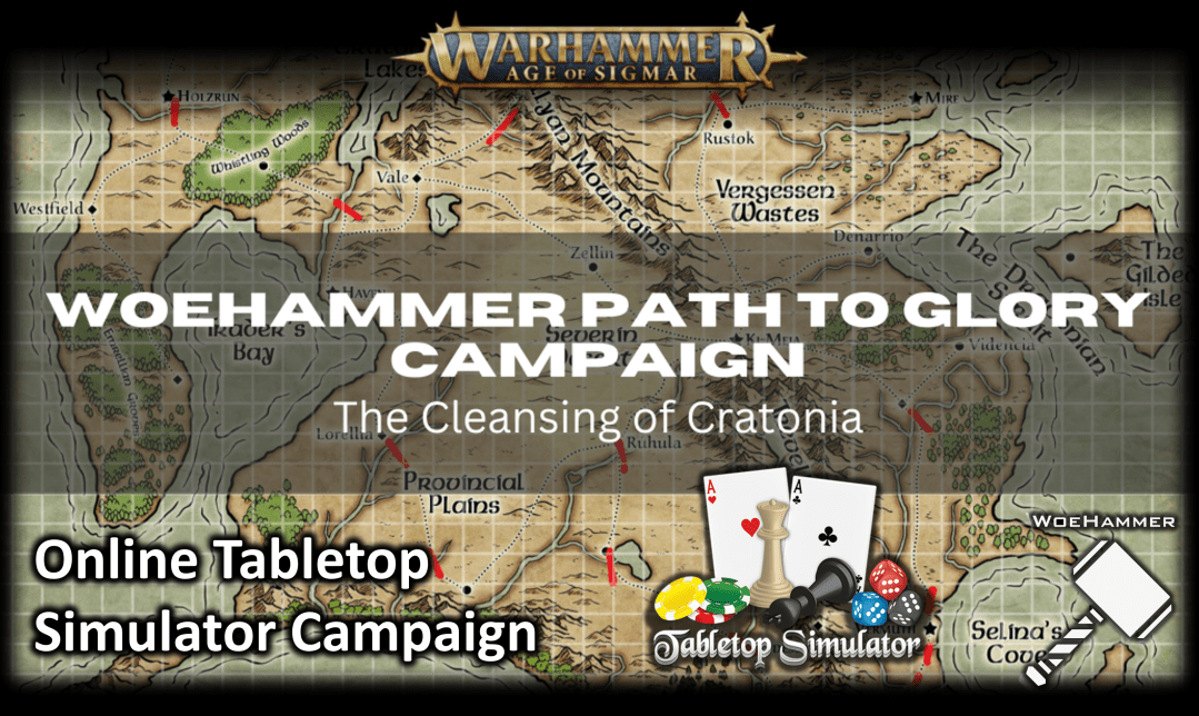 A new online narrative campaign is being run by Woehammer, with battles fought from all over the world over Tabletop Simulator, following Path to Glory rules and a custom ruleset for map movement and even secret marching orders!If you are interested in map campaign mechanics and gritty army movements, you'll want to sink your teeth … Continue reading Issuing secret orders in Woehammer’s TableTopSimulator “Path to Glory” Map campaign!