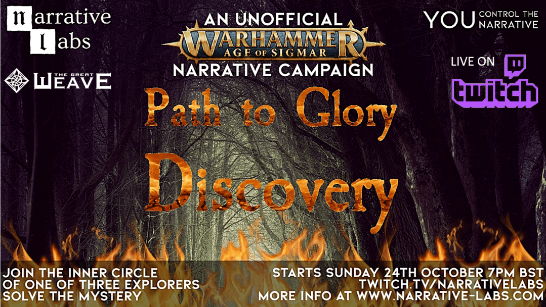 A new narrative campaign is starting at NarrativeLabs, the premier streaming channel for live narrative games of Age of Sigmar!This will be a Path to Glory campaign where the audience can directly influence the battles live on Twitch, and contribute to the strategic decisions of their favorite force in the campaign through the private strategy … Continue reading Live Play Narrative Campaign – Path to Glory: Discovery, on NarrativeLabs Twitch. Oct24 – Dec12 2021
