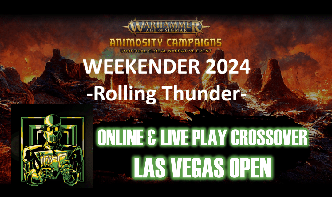 2024’s Animosity Weekender is taking place now, with both a Global Narrative Event available to players worldwide and in-person events at the Las Vegas Open (LVO) kicking off Friday, January 19th! Players are able to support the march of colossa-boss Mogrek Logblade as he rampages up the Ur-River toward Azyr, or the desperate delaying action … Continue reading Animosity Campaigns “Rolling Thunder” weekender – online and live play crossover at the Las Vegas Open