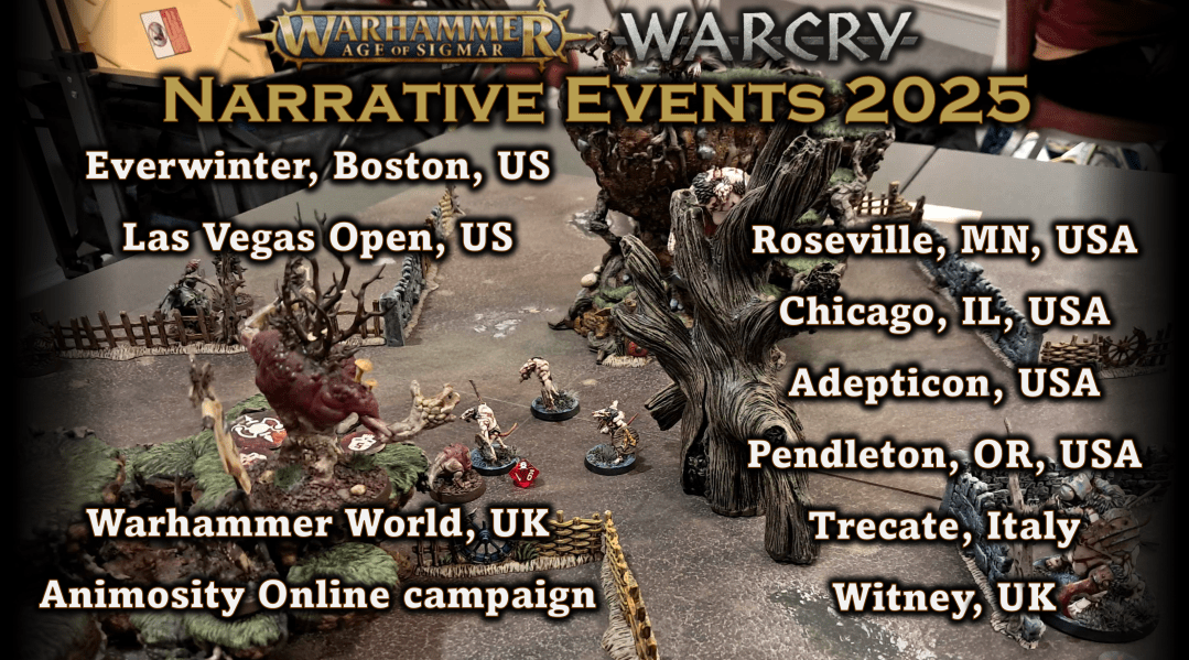 This year is starting with already quite a few narrative events, drawing in players from all over.The year is spearheaded (ha!) by Animosity Campaigns events, two in opposite corners of the US, one in WarhammerWorld and an online campaign that ties it all together. Several of these events, as usual, make use of campaign play … Continue reading AoS/Warcry Narrative Events in 2025