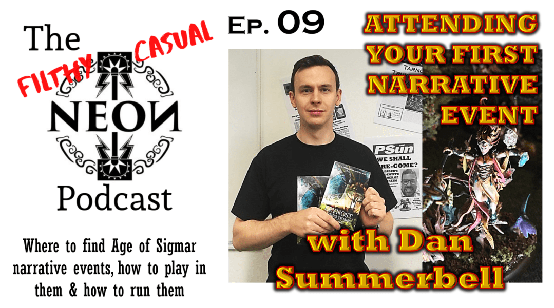 Premieres Saturday Dec4 5pm EST, 10pm BST, Dec5 9am AEST.Join us in the live chat!(https://youtu.be/vSkJ5DK0I8U) This episode is about attending your first narrative event, playing with other narrative gamers, and writing stories about your games and the Age of Sigmar. NEOs Aaron Bostian and Nuno Martins interview Dan Summerbell (@HobbySummerbell), narrative player and amateur writer … Continue reading The Casual NEON Podcast – Ep9: attending your first Narrative Event