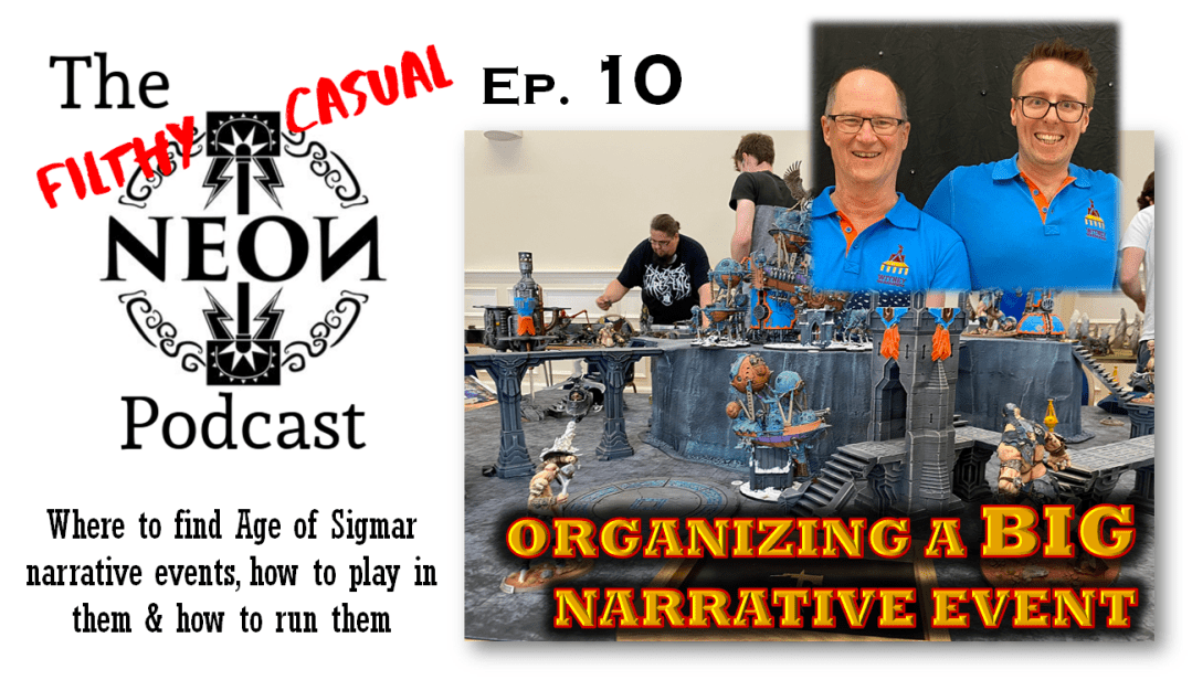 We want YOU to play narrative games in Age of Sigmar! Where to find them, how to play them, how to run them! We publicize recent and upcoming Age of Sigmar narrative events, as well as rules design and other narrative content producers.____________________________ This episode is all about organizing your first big narrative event: booking … Continue reading The Casual NEON Podcast – Ep10: running a big narrative event, w/ Phil Dodd & Charles Nolan