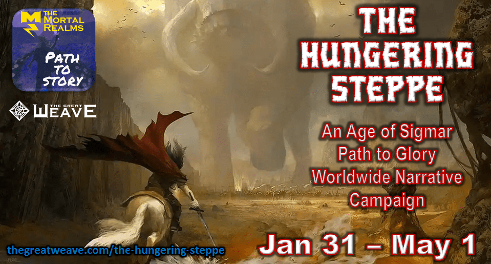 A new worldwide narrative event will start on the 31st of January, and run until May 1st. The Path to Story podcast and The Great Weave have united to bring to you all "The Hungering Steppe," a narrative Age of Sigmar Event! This event will focus on the Path to Glory system and encourages players to … Continue reading ‘The Hungering Steppe’ – a narrative AoS Path to Glory worldwide campaign – Jan 31st – May 1st