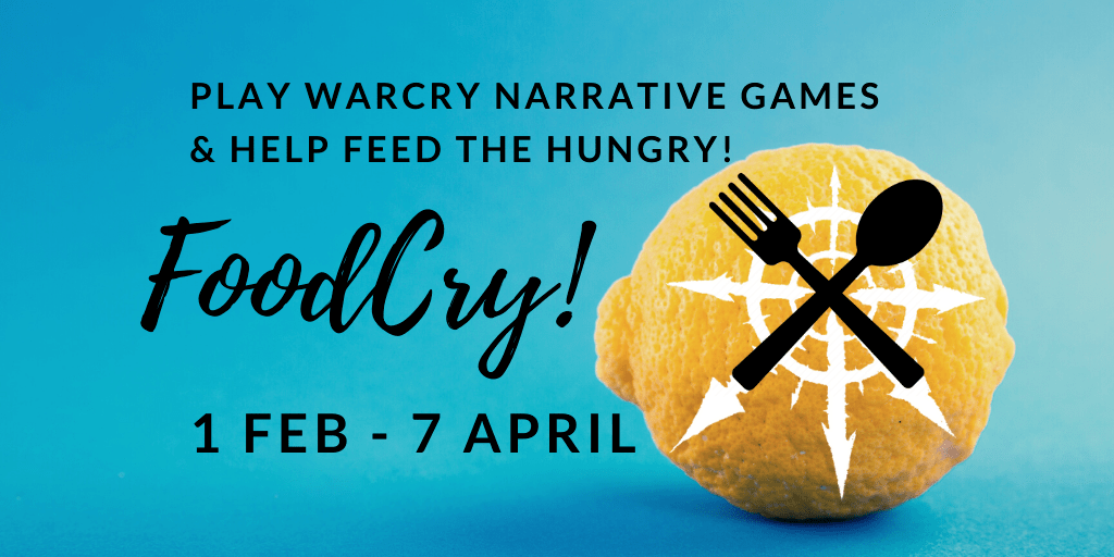FoodCry is a simple Warcry narrative event involving players participating in games to develop their quests during February & March as a two month period leading up to FoodCry Week, April 1st – 7th, 2020.